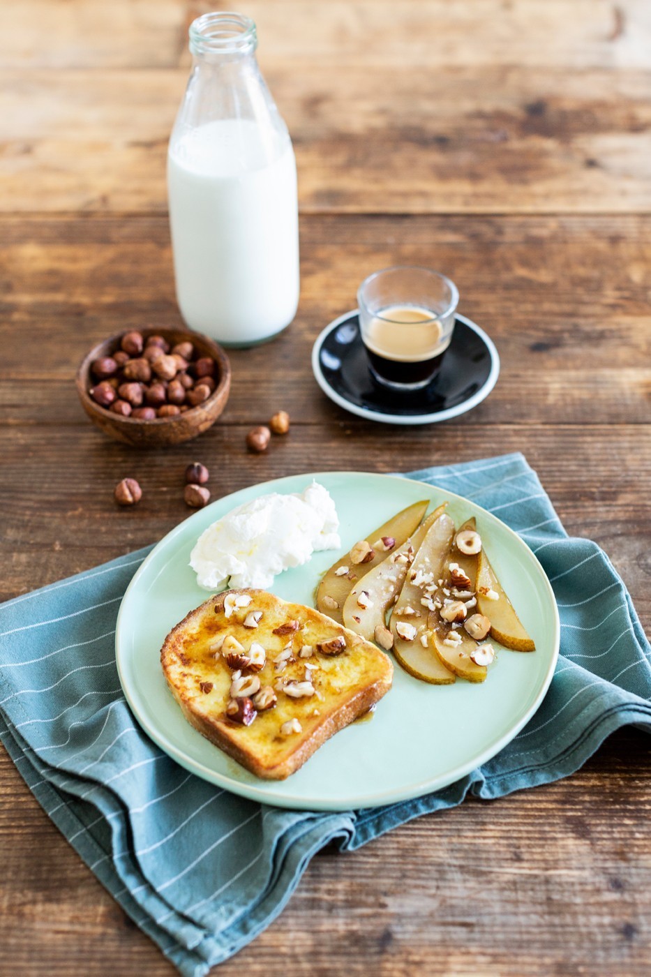 Serve with caramelized pears to the side, a generous spoonful of cheese- grate a little lemon zest on top, and chopped hazelnuts.